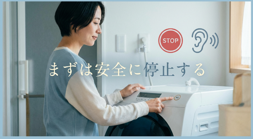 脱水中のガタガタは、回転が上がるほど本体が動いたり、壁・洗面台・防水パンの縁などに当たって音が増幅したりしやすい症状です。まずはスタート/一時停止で運転を止め、ふた(ドア)が開けられる状態になってから中を確認してください。