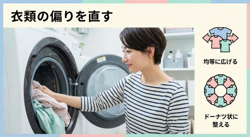 止めたら、洗濯物をいったんほぐし、できるだけ均等に、平らになるように入れ直します。ドーナツ状に整えると脱水しやすいと案内している例もあります。