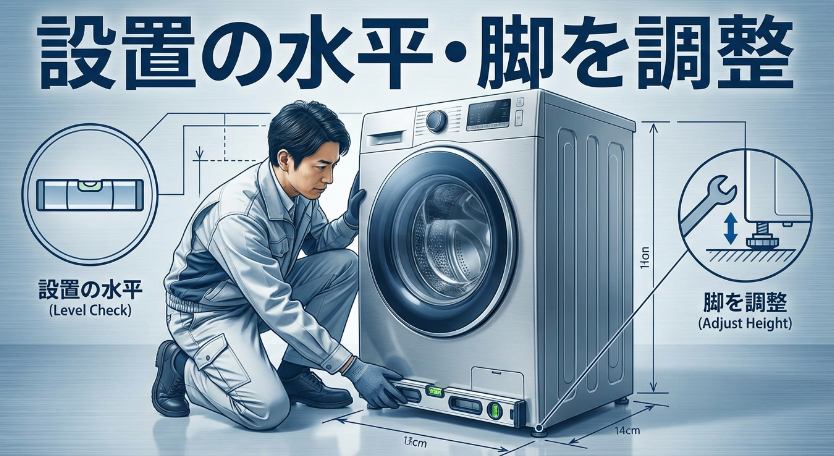 - 衣類側で改善しないなら、脚のガタつき確認と水準器での水平確認を行い、調整後は緩み止めを固定して再発を防ぎます