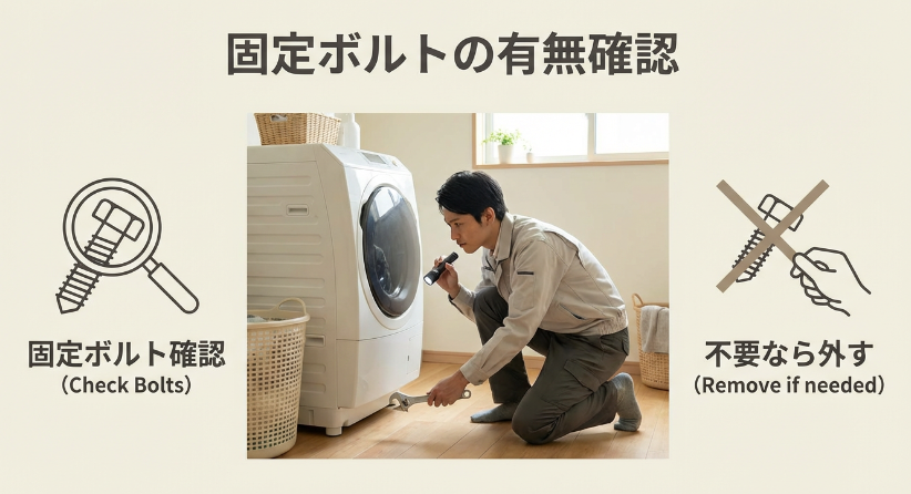 - 設置直後・引っ越し直後は、輸送用固定ボルト(包装用ボルト)の外し忘れも要確認
