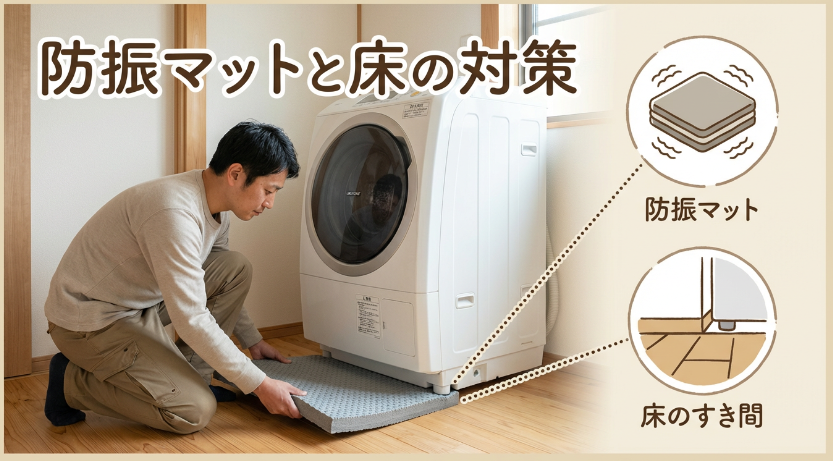 水平を出してガタつきをなくしても、床そのものがたわむ環境だと、脱水の揺れが残ることがあります。木造の2階や古い床などで床が一緒に震える感覚があるなら、防振マットや防振ゴム、かさ上げ台などの対策が効く場合があります。