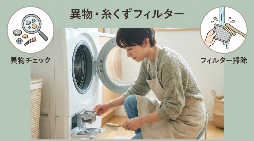 加えて、糸くずフィルターや排水フィルターの目詰まりも確認します。排水フィルターには排水時に出たゴミがたまるため、定期的なお手入れが必要で、目安として週1回を挙げているメーカー案内もあります。