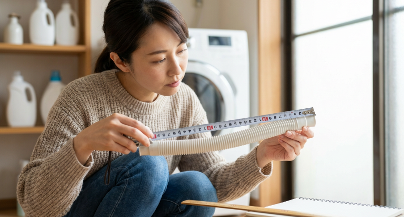 サイズを確認する最も確実な方法は、洗濯機の取扱説明書を参照することです。取扱説明書には排水ホースの仕様が記載されていることが多いです。取扱説明書が手元にない場合は、洗濯機の型番で検索すると情報が見つかることがあります。また、現在使用している排水ホースの内径と外径を直接測定する方法もあります。メジャーや定規で差し込み口の直径を測り、同じサイズの製品を探しましょう。